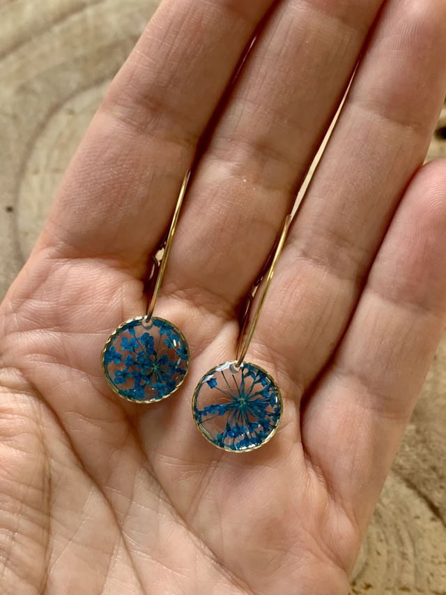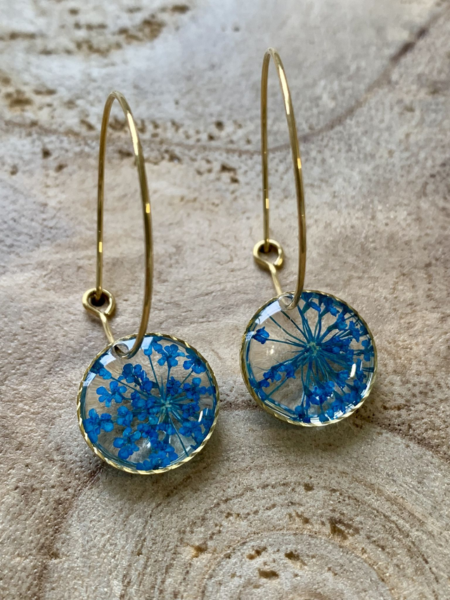 Pour créer ces bijoux, j'ai réalisé des pièces en résine, dans lesquelles j'ai inclu de véritables fleurs de carotte sauvage séchées, pressées et peintes en bleu. J'ai travaillé en plusieurs couches, afin de garantir une parfaite protection de l'inclusion. J'ai employé une base d'acier inoxydable doré à l'or fin, ce qui en fait un bijou hypoallergénique. Tous mes bijoux sont garantis 2 ans.