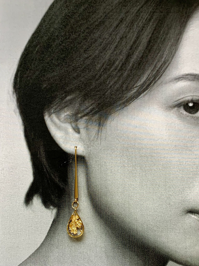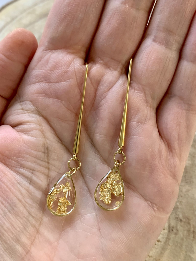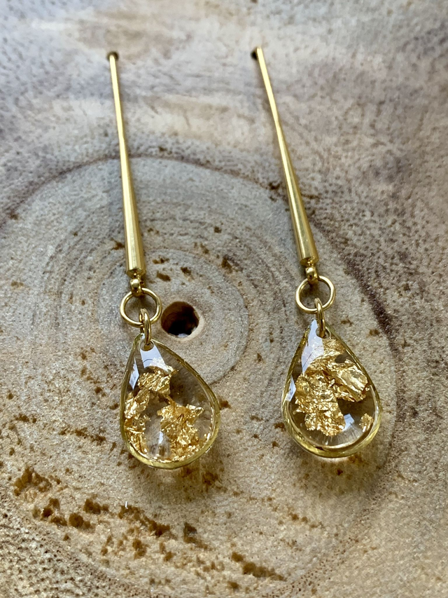 Pour créer ces bijoux, j'ai réalisé des pièces en résine, dans lesquelles j'ai inclu des morceaux de feuille d'or. J'ai travaillé en plusieurs couches, afin de garantir une parfaite protection de l'inclusion. J'ai employé une base d'acier inoxydable doré à l'or fin, ce qui en fait un bijou hypoallergénique. Tous mes bijoux sont garantis 2 ans.