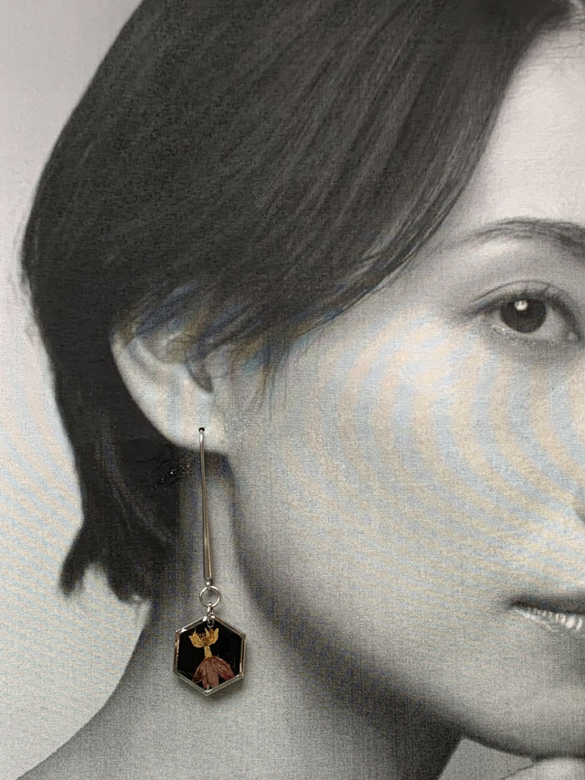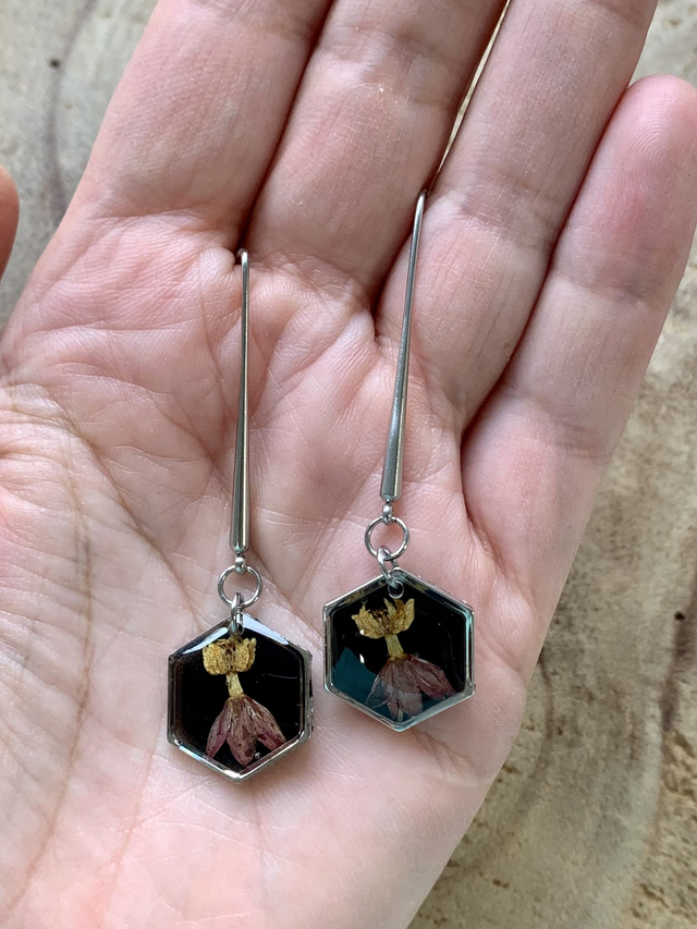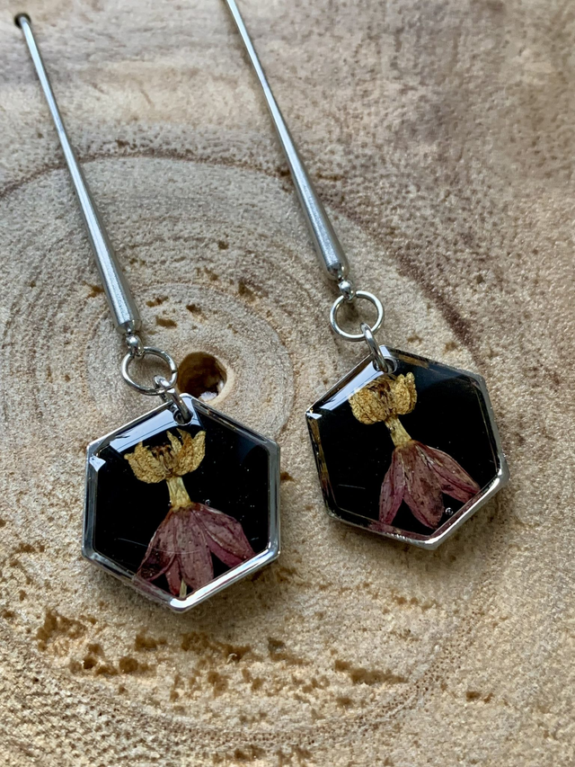 Pour créer ces bijoux, j'ai réalisé des pièces en résine, dans lesquelles j'ai inclu de véritables fleurs d'asclépias séchées et pressées, sur un fond de résine noire. J'ai travaillé en plusieurs couches, afin de garantir une parfaite protection de l'inclusion. J'ai employé une base d'acier inoxydable, ce qui en fait un bijou hypoallergénique. Tous mes bijoux sont garantis 2 ans.
