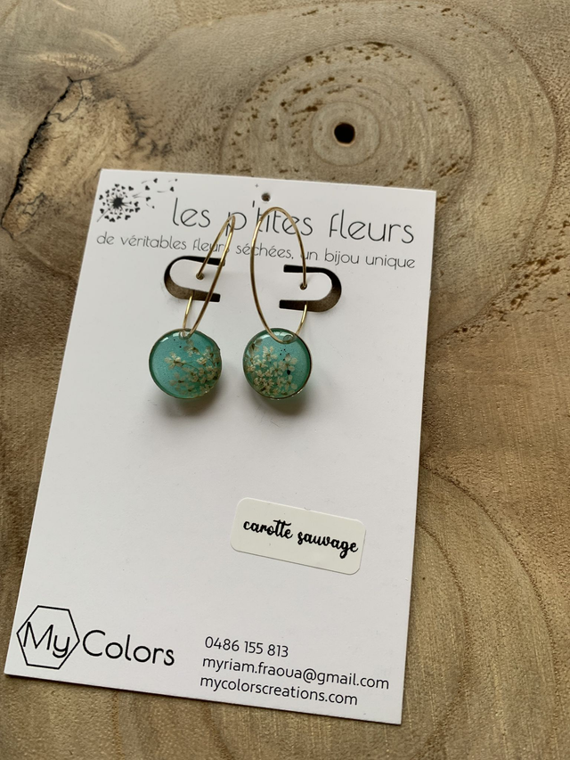 Pour créer ces bijoux, j'ai réalisé des pièces en résine, dans lesquelles j'ai inclu de véritables fleurs de carottes sauvages séchées et pressées, sur un fond de résine pigmentée. J'ai travaillé en plusieurs couches, afin de garantir une parfaite protection de l'inclusion. J'ai employé une base d'acier inoxydable doré à l'or fin, ce qui en fait un bijou hypoallergénique.
