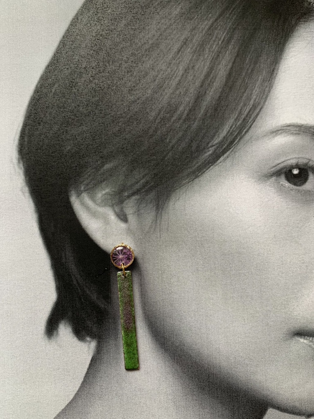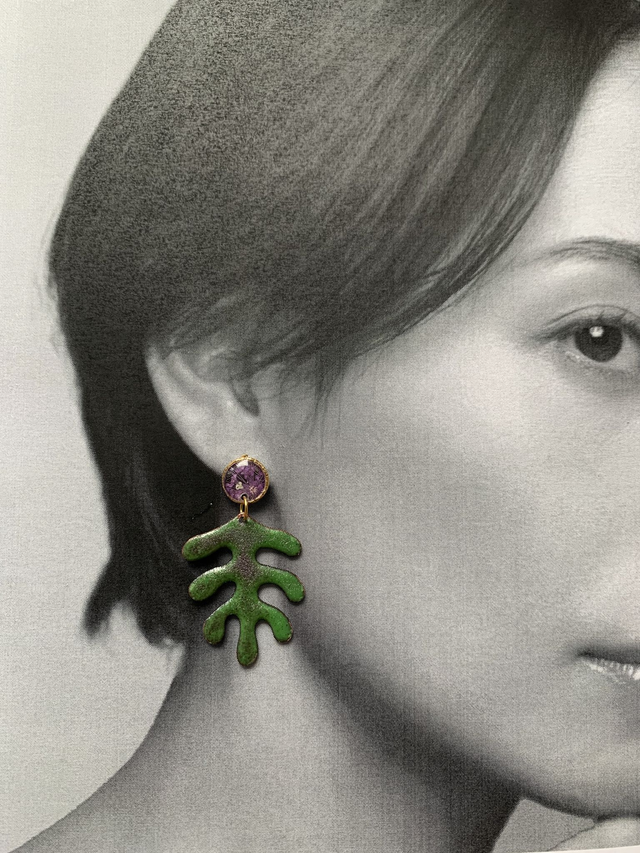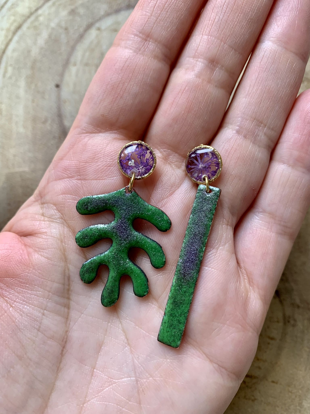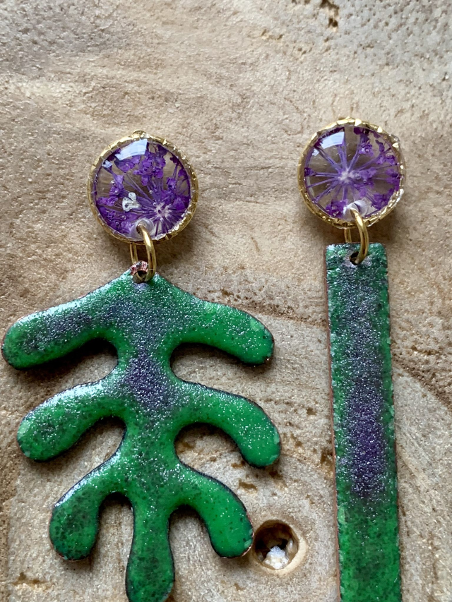Pour créer ces boucles d'oreilles, j'ai réalisé des puces d'oreilles en résine, incluant de véritables fleurs de carotte sauvage séchées, pressées et peintes en mauve. J'ai également travaillé de l'émail sur du cuivre, mêlant plusieurs nuances de vert et de mauve. Chaque couche et couleur d'émail a nécessité une cuisson à environ 850°c. J'ai monté les pièces sur de l'acier inoxydable doré à l'or fin. Les montures sont hypoallergéniques. Tous mes bijoux sont garantis 2 ans.