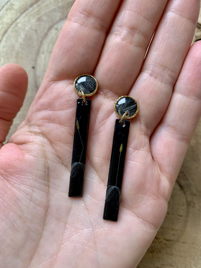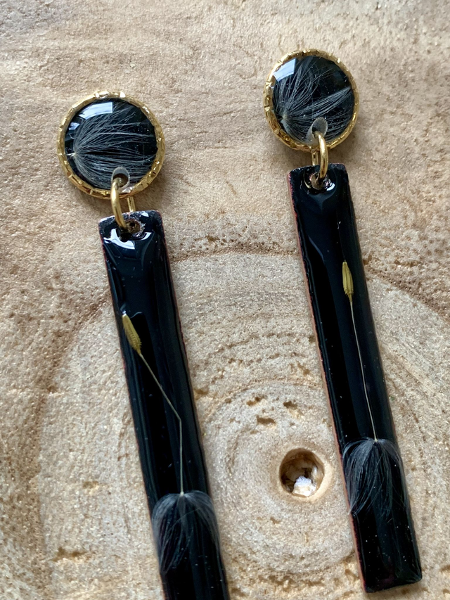 Pour créer ces boucles d'oreilles, j'ai réalisé des puces d'oreilles en résine, incluant de véritables pistils de pissenlits. J'ai également travaillé de l'émail noir sur du cuivre, ainsi qu'une apposition de pistils de pissenlits, recouverts d'une couche de résine. Chaque couche et couleur d'émail a nécessité une cuisson à environ 850°c. J'ai monté les pièces sur de l'acier inoxydable doré à l'or fin. Les montures sont hypoallergéniques. Tous mes bijoux sont garantis 2 ans.