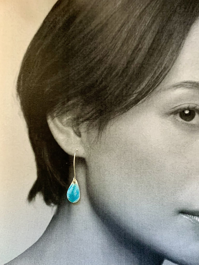 Pour créer ces boucles d'oreilles, j'ai réalisé des empreintes végétales de feuilles de sauge sur une pâte d'argent, que j'ai ensuite cuite au four à 900°c. J'ai façonné, poncé et poli chaque pièce, pour ensuite les émailler. Chaque couche d'émail nécessite une cuisson à environ 800°c. Ces pièces sont émaillées des deux côtés.