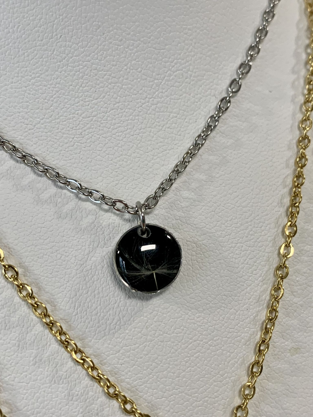 Pour créer ce bijou, j'ai réalisé une pièce en résine, dans laquelle j'ai inclu un véritable pistil de pissenlit sur un fond de résine noire. J'ai travaillé en plusieurs couches, afin de garantir une parfaite protection de l'inclusion. J'ai employé une base d'acier inoxydable, ce qui en fait un bijou hypoallergénique. Tous mes bijoux sont garantis 2 ans.