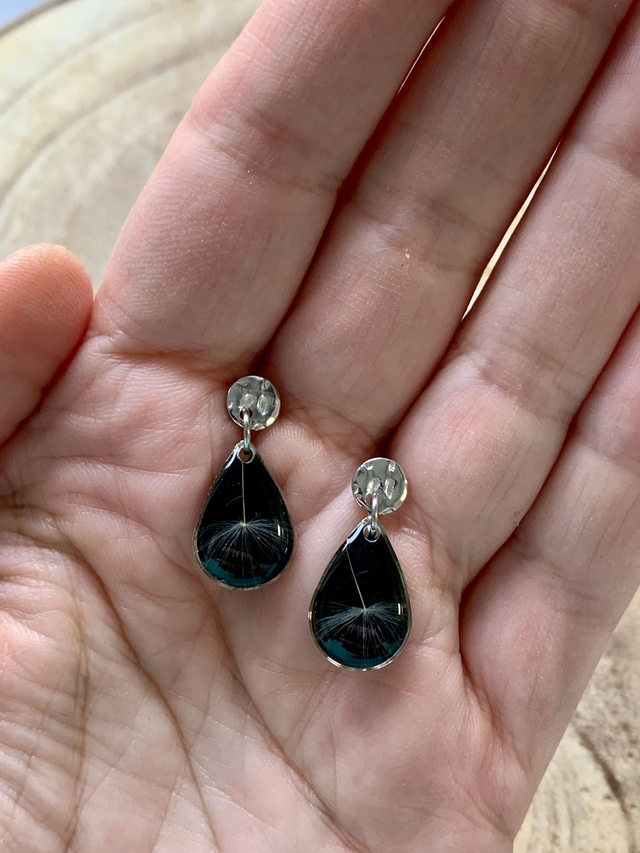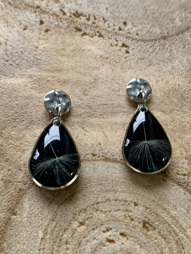 Pour créer ces bijoux, j'ai réalisé des pièces en résine, dans lesquelles j'ai inclu de véritables pistils de pissenlits, sur un fond de résine noire. J'ai travaillé en plusieurs couches, afin de garantir une parfaite protection de l'inclusion. J'ai employé une base d'acier inoxydable, ce qui en fait un bijou hypoallergénique. Tous mes bijoux sont garantis 2 ans.