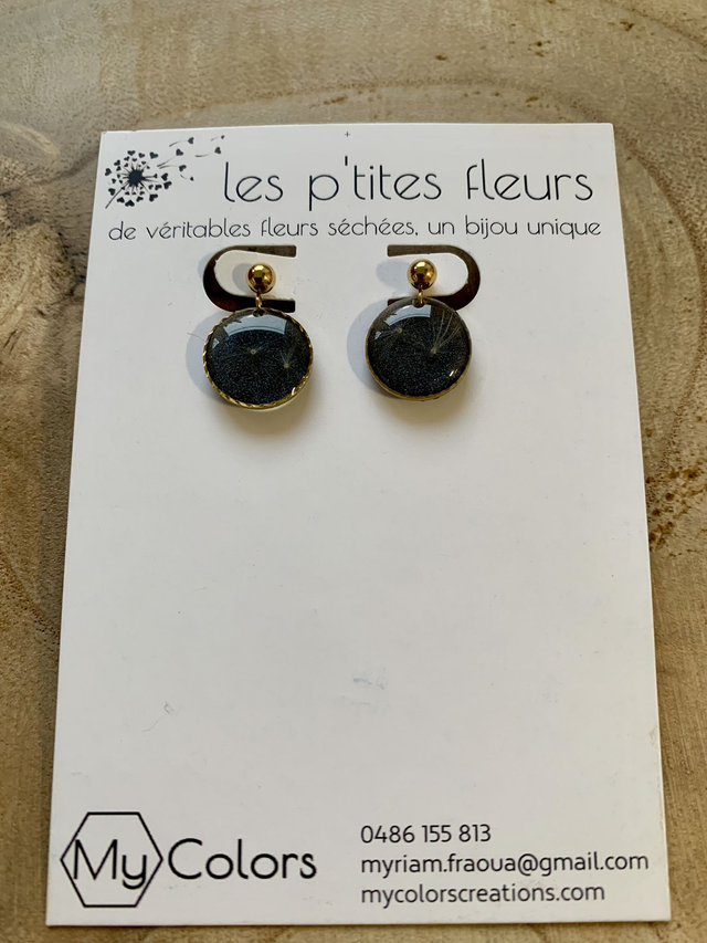 Pour créer ces bijoux, j'ai réalisé des pièces en résine, dans lesquelles j'ai inclu de véritables fleurs de pissenlits sur un fond de résine coloré en noir. J'ai travaillé en plusieurs couches, afin de garantir une parfaite protection de l'inclusion. J'ai employé une base d'acier inoxydable doré à l'or fin, ce qui en fait un bijou hypoallergénique.