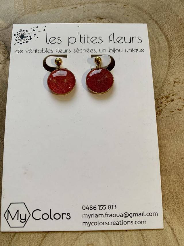 Pour créer ces bijoux, j'ai réalisé des pièces en résine, dans lesquelles j'ai inclu de véritables fleurs de pissenlits sur un fond de résine coloré en rouge bordeaux . J'ai travaillé en plusieurs couches, afin de garantir une parfaite protection de l'inclusion. J'ai employé une base d'acier inoxydable doré à l'or fin, ce qui en fait un bijou hypoallergénique.