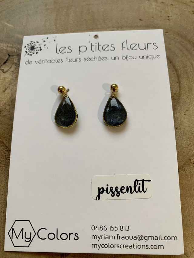 Pour créer ces bijoux, j'ai réalisé des pièces en résine, dans lesquelles j'ai inclu de véritables fleurs de pissenlits sur un fond de résine coloré en noir. J'ai travaillé en plusieurs couches, afin de garantir une parfaite protection de l'inclusion. J'ai employé une base d'acier inoxydable doré à l'or fin, ce qui en fait un bijou hypoallergénique.