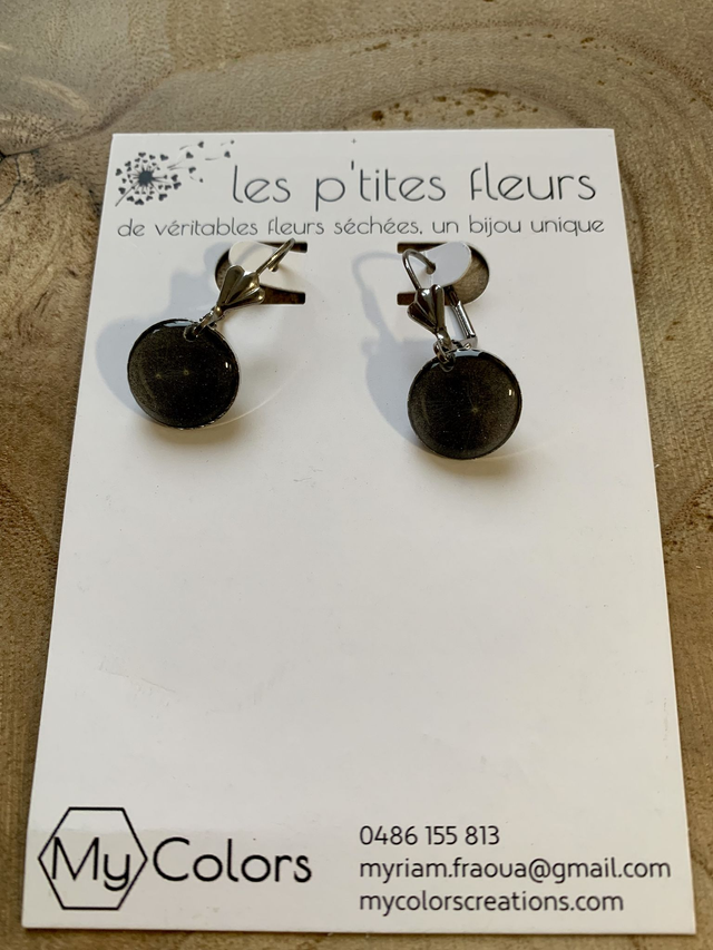 Pour créer ces bijoux, j'ai réalisé des pièces en résine, dans lesquelles j'ai inclu de véritables fleurs de pissenlits sur un fond de résine coloré en noir. J'ai travaillé en plusieurs couches, afin de garantir une parfaite protection de l'inclusion. J'ai employé une base d'acier inoxydable, ce qui en fait un bijou hypoallergénique.