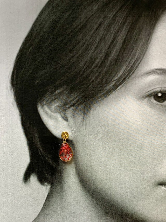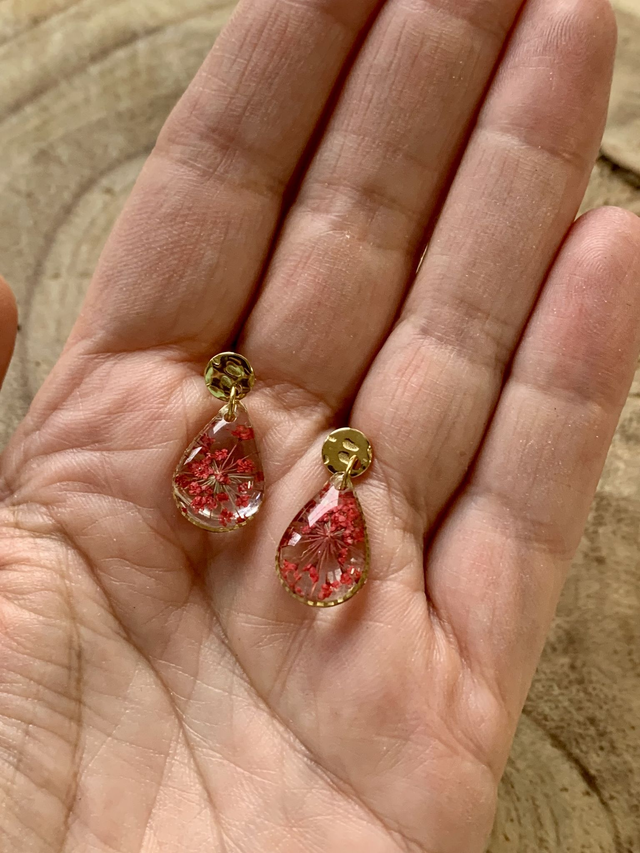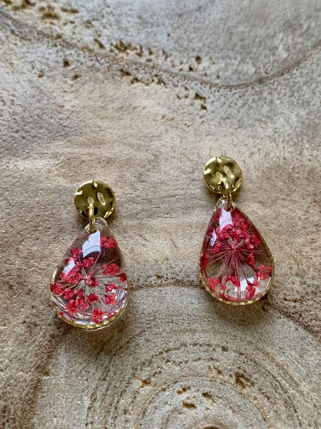 Pour créer ces bijoux, j'ai réalisé des pièces en résine, dans lesquelles j'ai inclu de véritables fleurs de carotte sauvage séchées, pressées et peintes en rouge. J'ai travaillé en plusieurs couches, afin de garantir une parfaite protection de l'inclusion. J'ai employé une base d'acier inoxydable doré à l'or fin, ce qui en fait un bijou hypoallergénique. Tous mes bijoux sont garantis 2 ans.