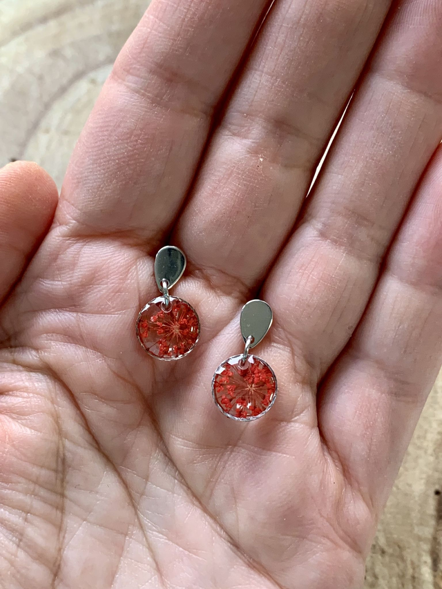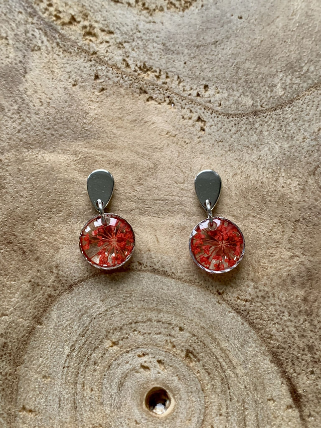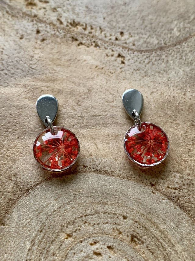 Pour créer ces bijoux, j'ai réalisé des pièces en résine, dans lesquelles j'ai inclu de véritables fleurs de carotte sauvage séchées, pressées et peintes en rouge. J'ai travaillé en plusieurs couches, afin de garantir une parfaite protection de l'inclusion. J'ai employé une base d'acier inoxydable, ce qui en fait un bijou hypoallergénique. Tous mes bijoux sont garantis 2 ans.