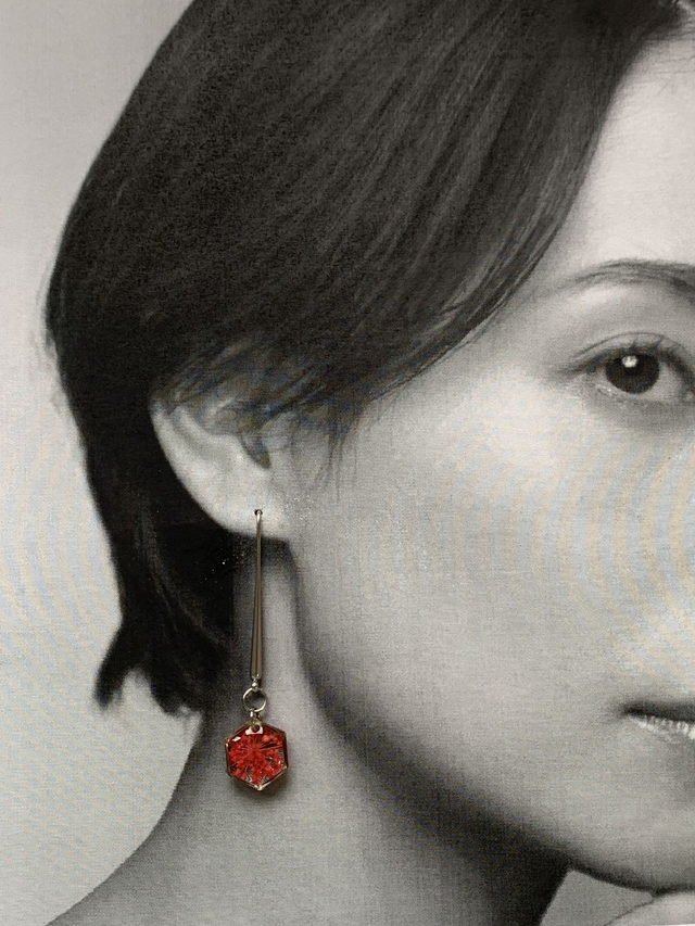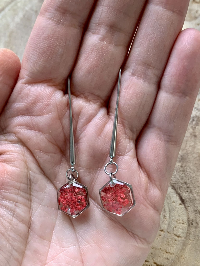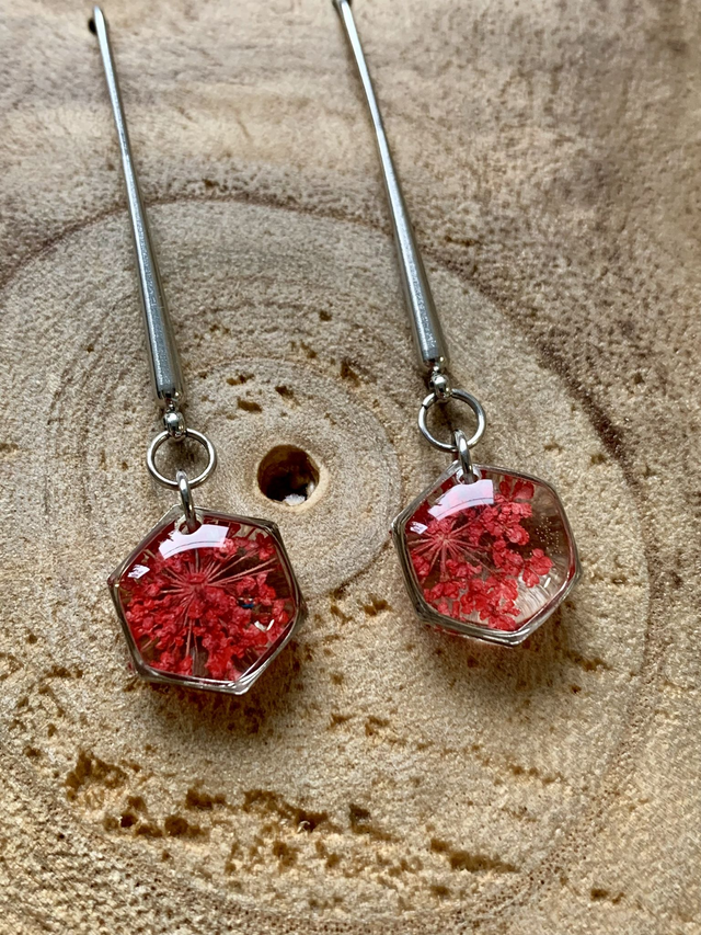 Pour créer ces bijoux, j'ai réalisé des pièces en résine, dans lesquelles j'ai inclu de véritables fleurs de carotte sauvage séchées, pressées et peintes en rouge. J'ai travaillé en plusieurs couches, afin de garantir une parfaite protection de l'inclusion. J'ai employé une base d'acier inoxydable, ce qui en fait un bijou hypoallergénique. Tous mes bijoux sont garantis 2 ans.
