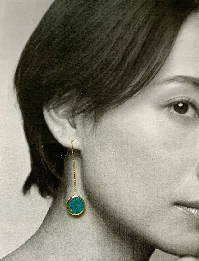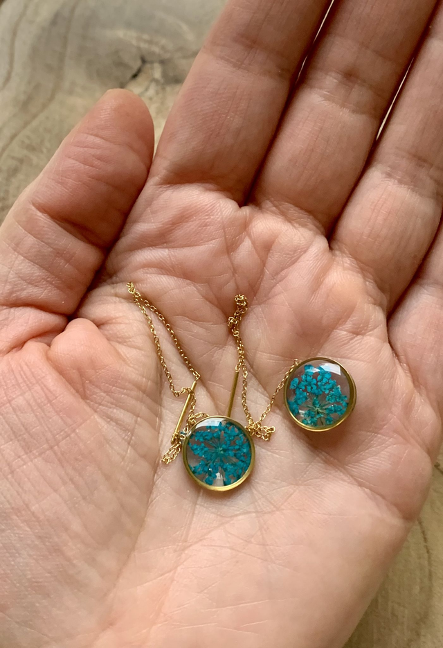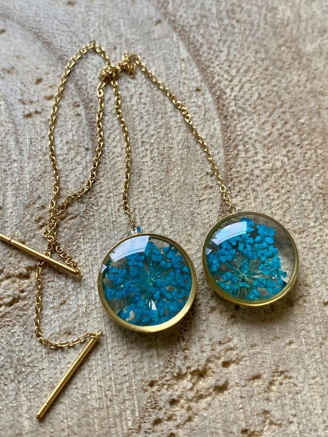 Pour créer ces bijoux, j'ai réalisé des pièces en résine, dans lesquelles j'ai inclu de véritables fleurs de carotte sauvage séchées, pressées et peintes en turquoise. J'ai travaillé en plusieurs couches, afin de garantir une parfaite protection de l'inclusion. J'ai employé une base d'acier inoxydable doré à l'or fin, ce qui en fait un bijou hypoallergénique. Tous mes bijoux sont garantis 2 ans.