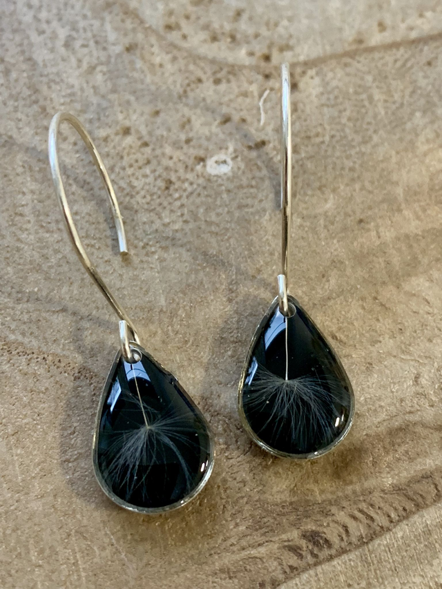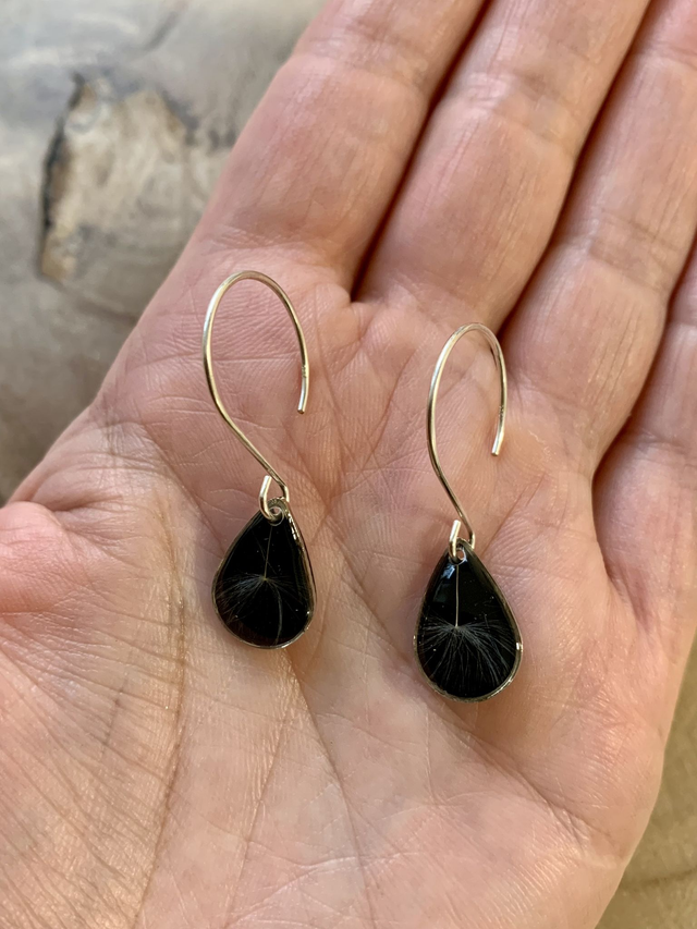 Pour créer ces bijoux, j'ai réalisé des pièces en résine, dans lesquelles j'ai inclu de véritables pistils de pissenlits, sur un fond de résine noire. J'ai travaillé en plusieurs couches, afin de garantir une parfaite protection de l'inclusion. J'ai employé une base d'argent, ce qui en fait un bijou hypoallergénique. Tous mes bijoux sont garantis 2 ans.