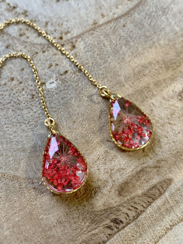 Pour créer ces bijoux, j'ai réalisé des pièces en résine, dans lesquelles j'ai inclu de véritables fleurs de carotte sauvage séchées, pressées et peintes en rouge. J'ai travaillé en plusieurs couches, afin de garantir une parfaite protection de l'inclusion. J'ai employé une base de goldfilled, ce qui en fait un bijou hypoallergénique. Tous mes bijoux sont garantis 2 ans. Le goldfilled est constitué d'une base de laiton recouvert d'un placage d'or très épais, équivalent à 20% du poids du bijou.