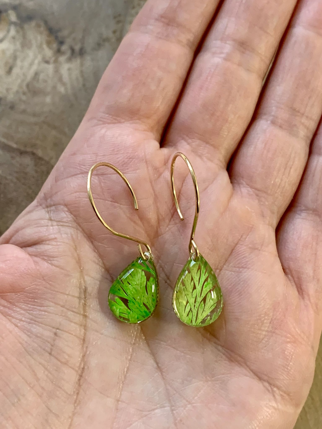 Pour créer ces bijoux, j'ai réalisé des pièces en résine, dans lesquelles j'ai inclu de véritables feuilles de persil séchées et pressées. J'ai travaillé en plusieurs couches, afin de garantir une parfaite protection de l'inclusion. J'ai employé une base de goldfilled, ce qui en fait un bijou hypoallergénique. Tous mes bijoux sont garantis 2 ans. Le goldfilled est constitué d'une base de laiton recouverte d'un placage d'or très épais, équivalent à 20% du poids du bijou.
