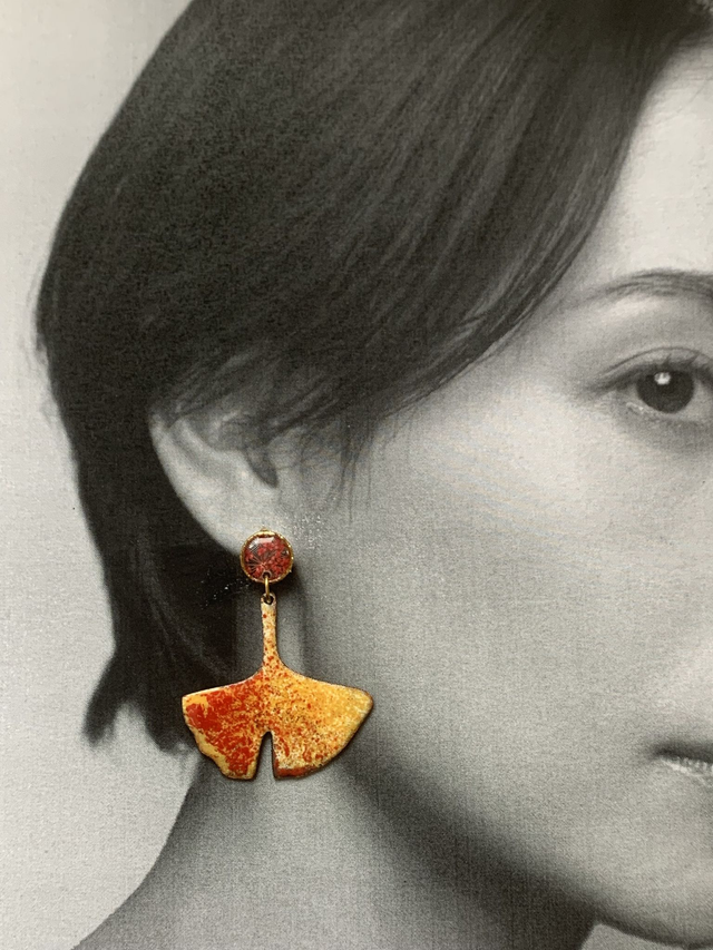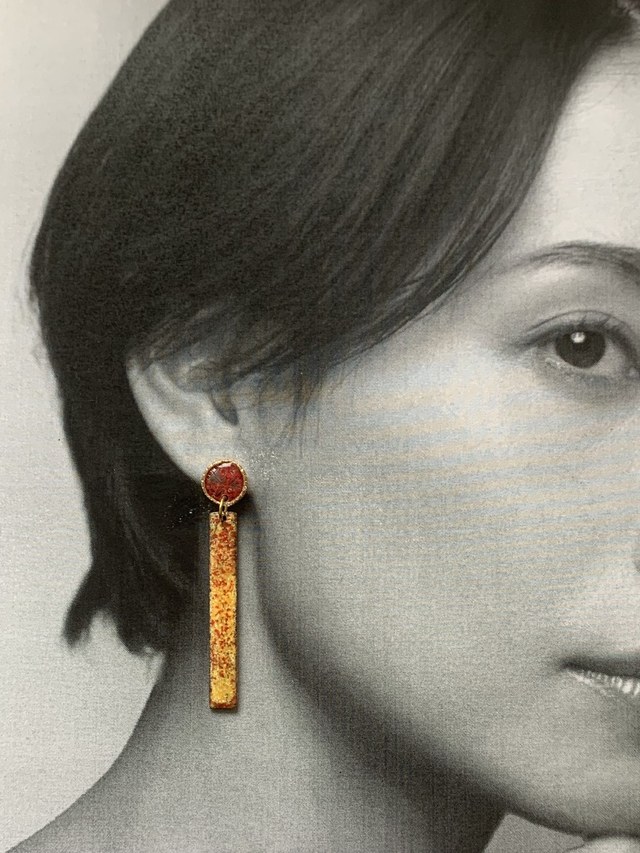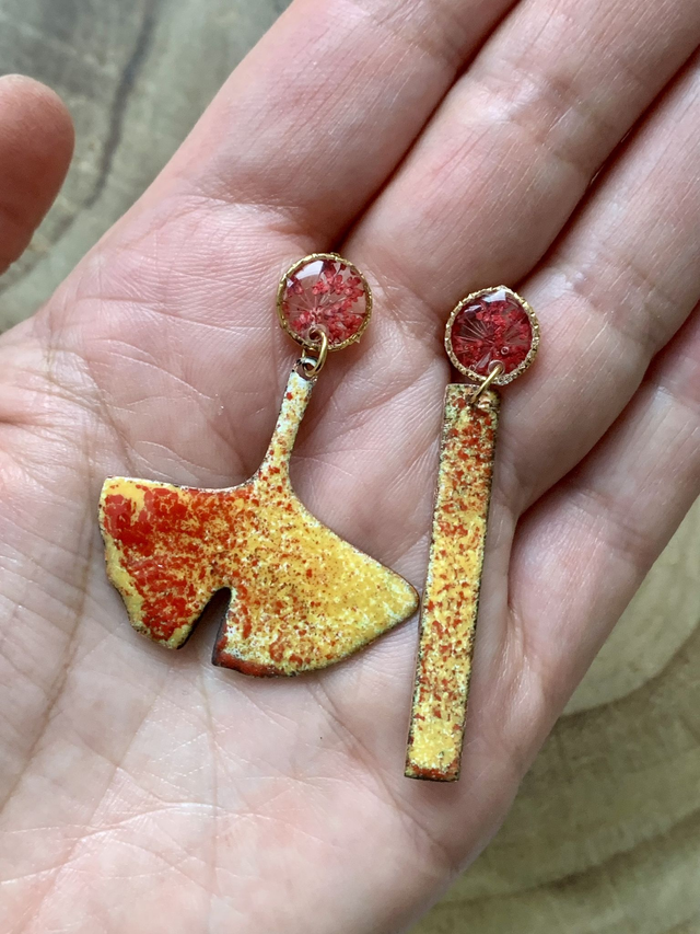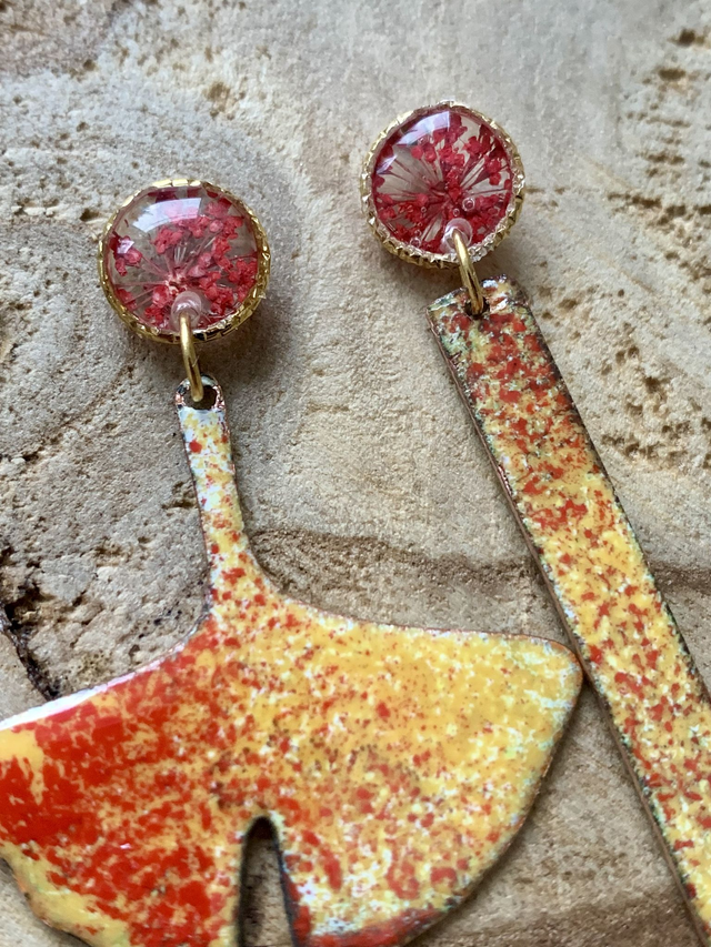 Pour créer ces boucles d'oreilles, j'ai réalisé des puces d'oreilles en résine, incluant de véritables fleurs de carotte sauvage séchées, pressées et peintes en mauve. J'ai également travaillé de l'émail sur du cuivre, mêlant plusieurs nuances de rouge et de jaune. Chaque couche et couleur d'émail a nécessité une cuisson à environ 850°c. J'ai monté les pièces sur de l'acier inoxydable doré à l'or fin. Les montures sont hypoallergéniques. Tous mes bijoux sont garantis 2 ans.